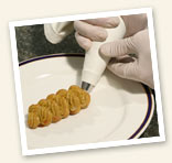 Lessare le patate e le castagne, togliere le rispettive bucce e passare con un passatutto, salare e aggiungere le uova; fare la treccia con un sacchetto da pasticceria con la punta rigata, pennellare con l'uovo battuto e gratinare in forno a 180° per 5 minuti.